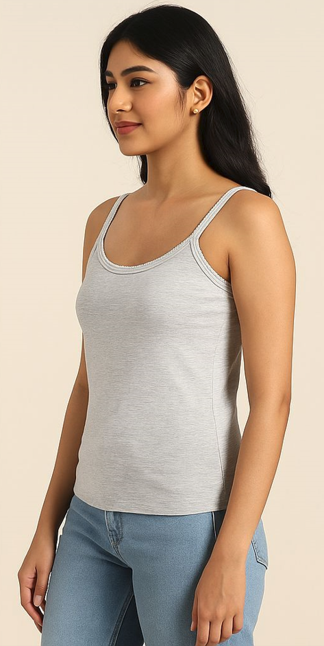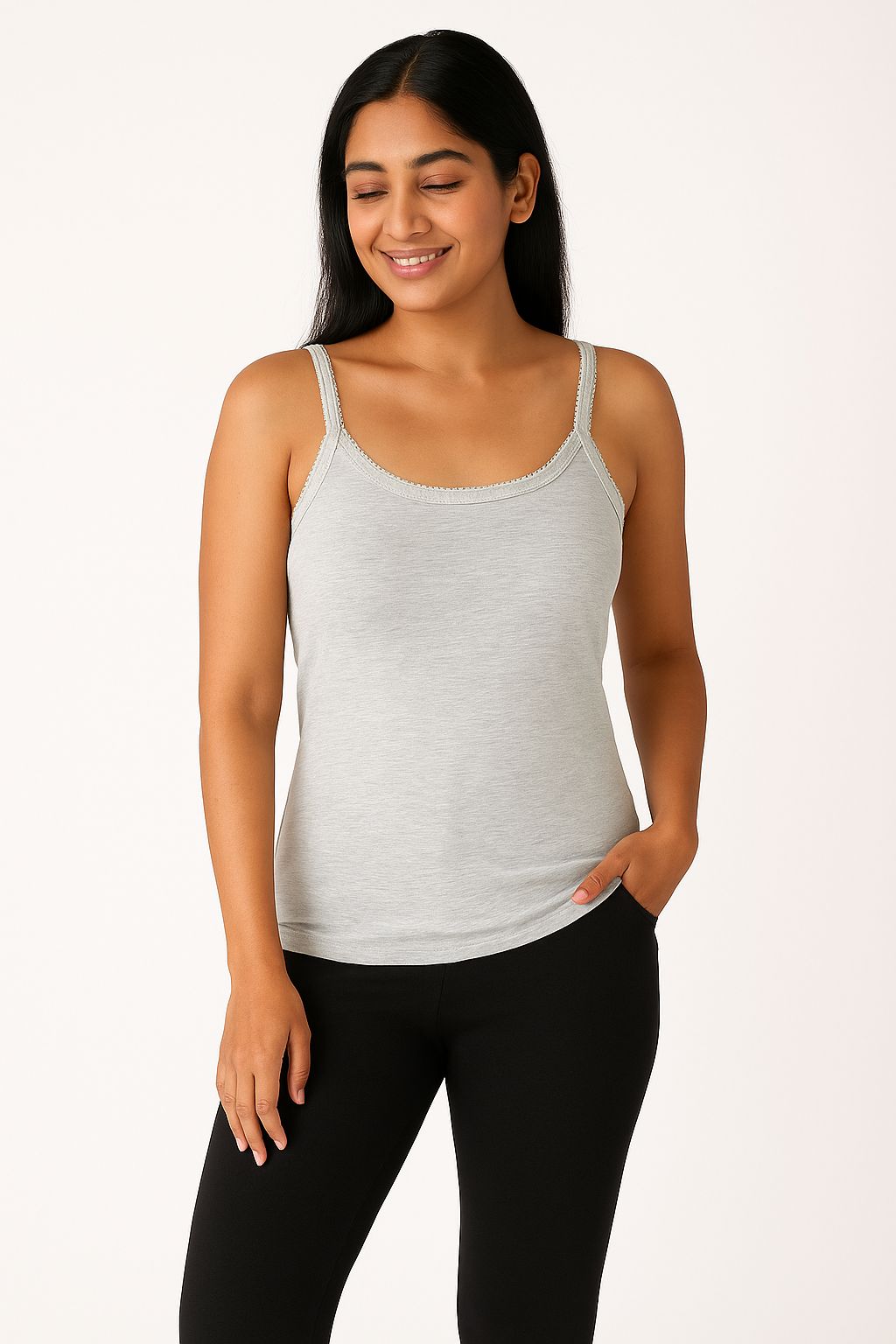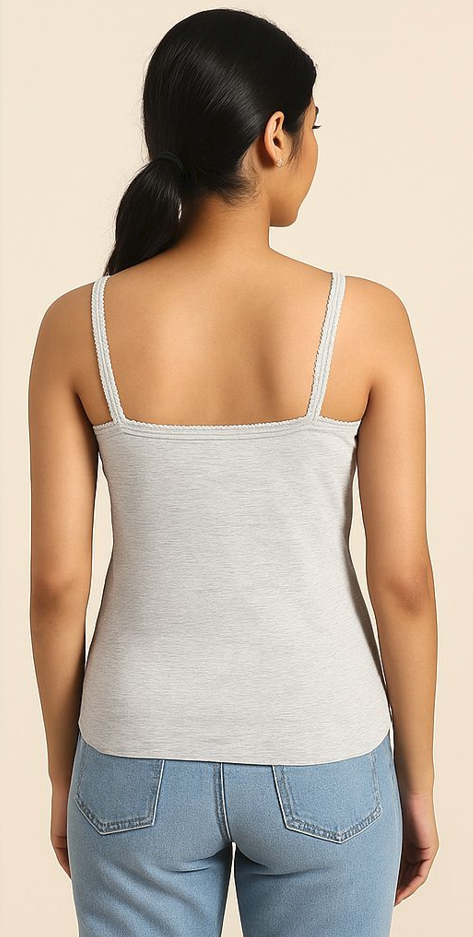 Upgrade your everyday essentials with this soft light grey camisole. Designed with delicate lace-trimmed straps and neckline, it offers the perfect mix of comfort and style.