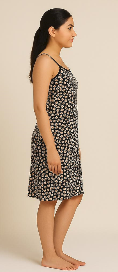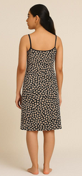 Step into effortless comfort with this chic black slip dress featuring an all-over daisy print. Designed with delicate spaghetti straps and a relaxed silhouette, it’s perfect for lounging, bedtime, or casual at-home wear.